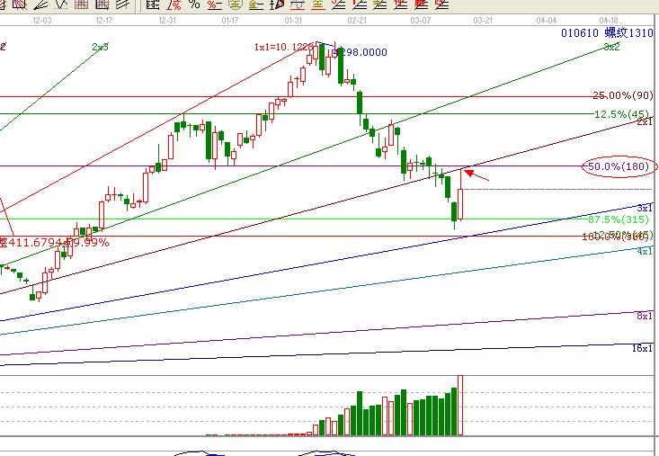 贏家輪中輪使用方法:選擇一個(gè)重要的低點(diǎn)點(diǎn)擊12年9月6號(hào)低點(diǎn)3309點(diǎn),下方會(huì)出現(xiàn)一個(gè)黑色的三角,這就選點(diǎn)成功了,然后我們?cè)偃c(diǎn)擊工具欄中的江恩輪,然后找到0度位置對(duì)應(yīng)的是不是3309點(diǎn),然后逆勢(shì)針旋轉(zhuǎn),發(fā)現(xiàn)螺紋1310目前運(yùn)行至75度壓力3929點(diǎn)位置,3月15日下午最高點(diǎn)3920點(diǎn),之后震蕩回落,