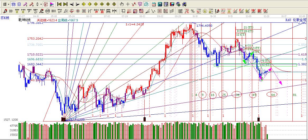 按照歷史我們?nèi)?fù)制一個969【實際是968】一個循環(huán)這一波反彈強(qiáng)壓力在黃金分割1.382位置1683.3及1672.5這里將構(gòu)成一個強(qiáng)的壓力區(qū)間,如果時間跟價格平衡,那么黃金在一次上演多空大戰(zhàn)。