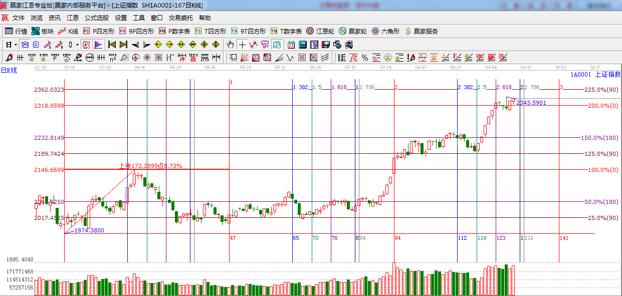 江恩看盤綜述:依據(jù)贏家江恩技術(shù)工具分析得出:周一低開下探江恩0度支撐2318點(diǎn)后,再次震蕩上攻2340點(diǎn),終盤小陽線報(bào)收,量能同比放大,9月9日之后的平臺(tái)整理,顯示多方蓄勢(shì)意圖,預(yù)計(jì)短期市場(chǎng)將繼續(xù)以震蕩攀升走勢(shì)為主,操作上,投資者切忌盲目追高和頻繁調(diào)倉(cāng)換股,可適當(dāng)降低倉(cāng)位。