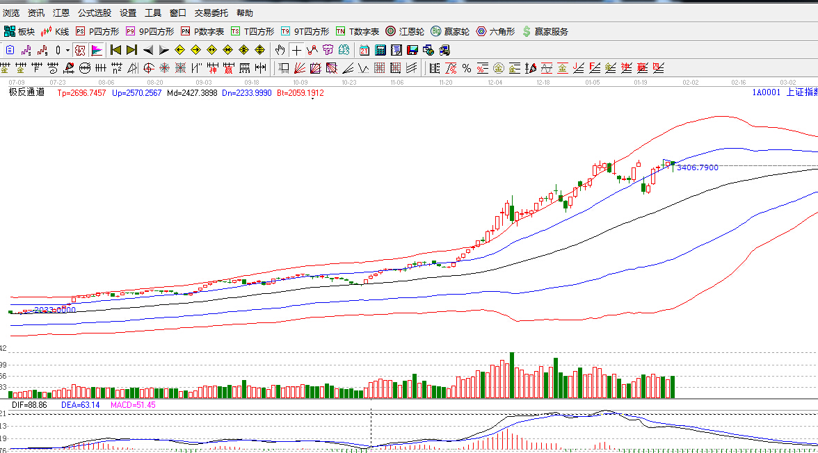 極反通道提示:滬指圍繞極反通道藍色外軌線震蕩,盤中破位藍色外軌線,陰錘頭線報收,明日如不能收復,短線謹慎。