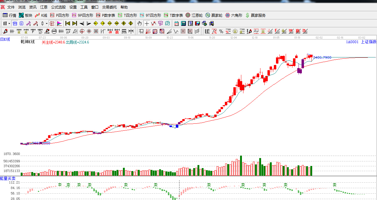 ★依據(jù)贏家江恩理論系統(tǒng)乾坤K線提示:紅色區(qū)域,短線出局線之上,短線出局線不破,看多。