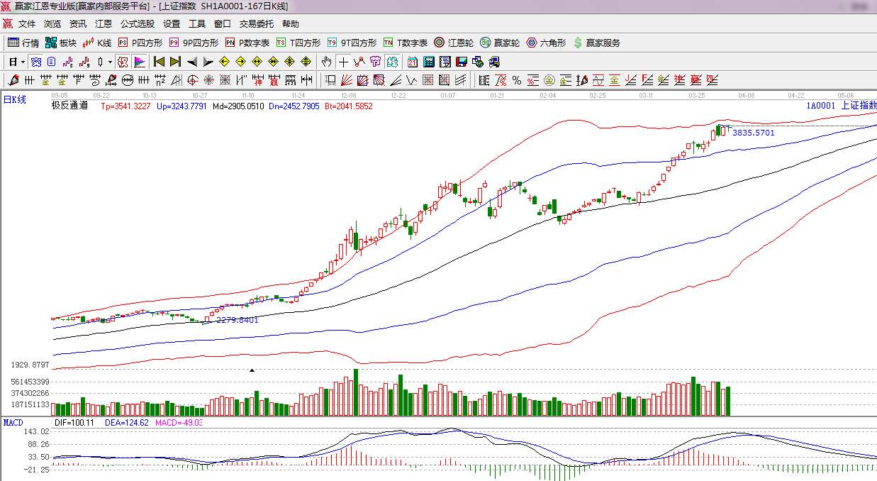 江恩看盤綜述:依據(jù)贏家江恩技術工具分析得出:周四盤面保持震蕩,板塊出現(xiàn)一定分化,盤中一度跳水尾盤迅速回升,資金承接力依然看漲,下方支撐江恩90度3783點,此位置不破,短期震蕩上行或將延續(xù),盤中調整仍是機會,由于頻臨外軌線之下,順勢的同時并保留一份謹慎。操作上,逢低繼續(xù)關注金融股,首選仍是券商;煤炭、有色、電力、化工;而國企改革、一帶一路等仍是中期關注焦點。此外,軍工、傳媒等題財股或反復活躍,可波段關注。