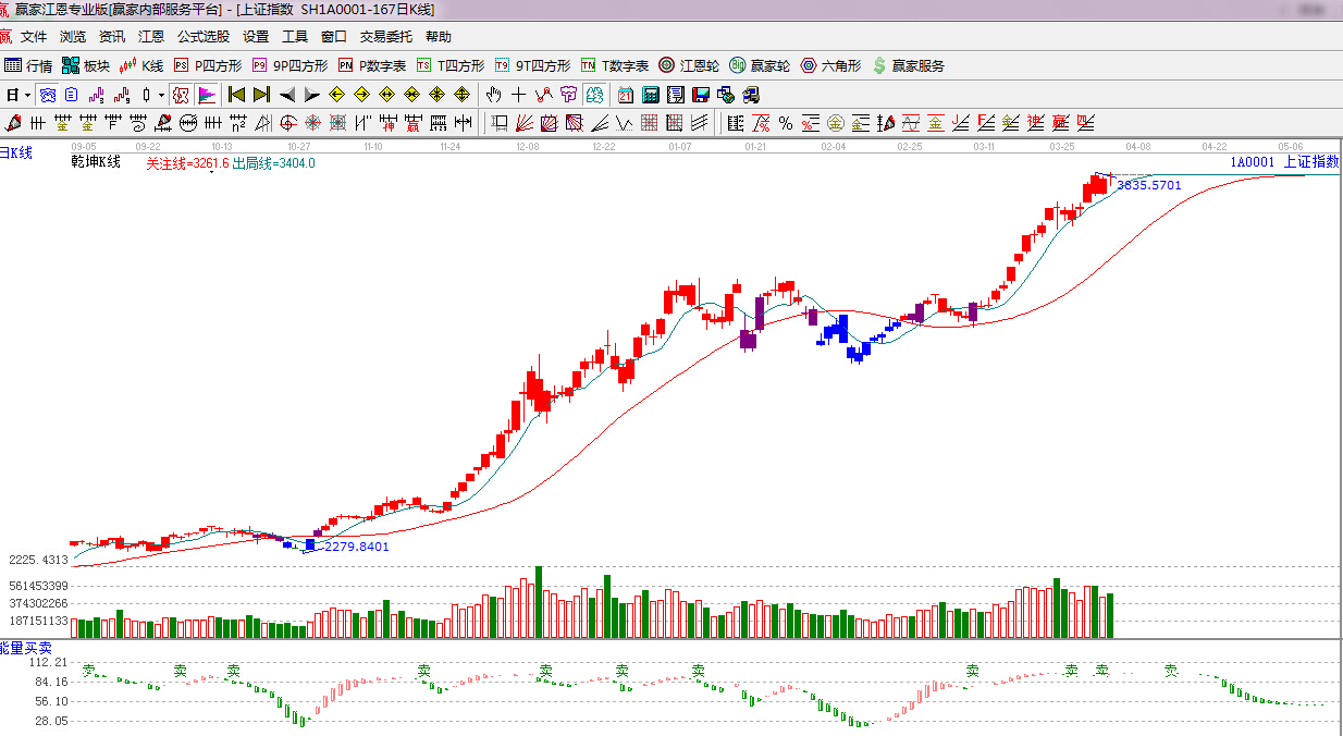★依據(jù)贏家江恩理論系統(tǒng)乾坤K線提示:紅色k線,綠色線上方,留意綠色短線出局線得失。