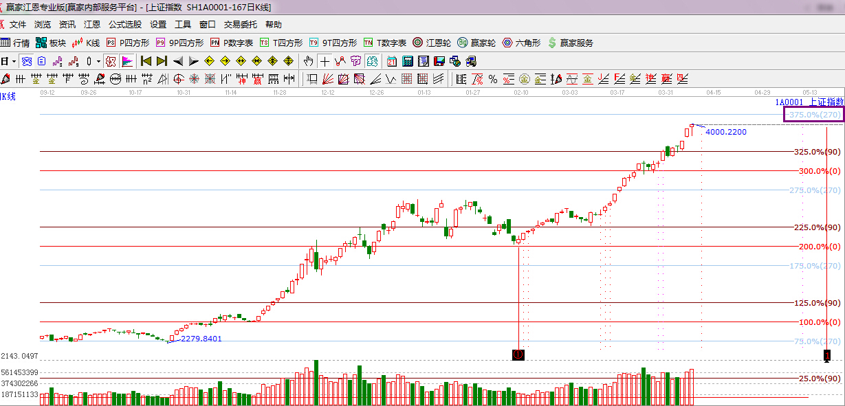 ★依據(jù)贏家江恩理論系統(tǒng)波段百分比提示:依據(jù)規(guī)則下一目標(biāo)位是江恩270度4081點(diǎn)。