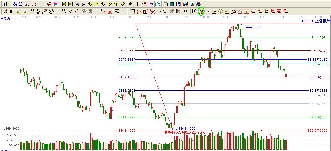 ★依據(jù)贏波段百分比提示:大盤1949.46點至2444.80點回調(diào)目前處于180度位置2197.13點,這里不破看高一線至135度位置2259.04點