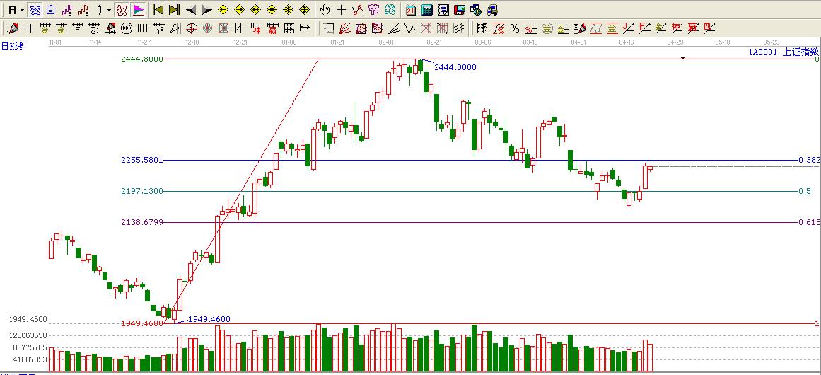 ☆依據(jù)黃金價格回調(diào)支撐位提示:0.382位置2255.58點構(gòu)成短期壓力,大盤蓄勢后有望觸摸0.382位置。