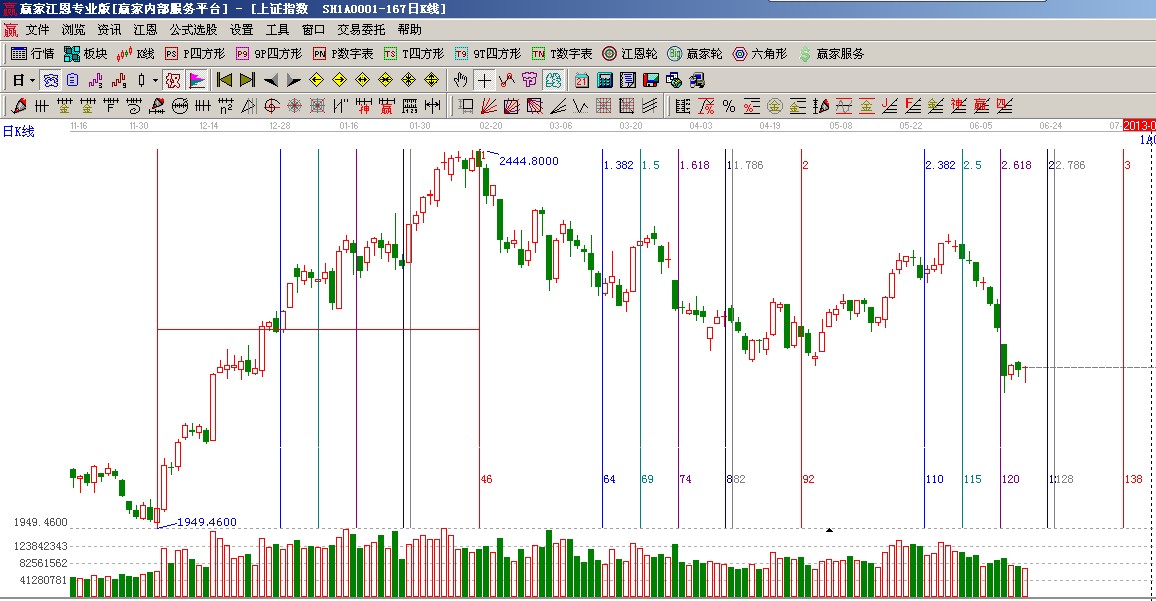 ★依據(jù)贏家江恩系統(tǒng)黃金時間周期線提示:從1949點至2444點做時間圖(3),分鐘圖時間窗18、19,日線時間窗21號;