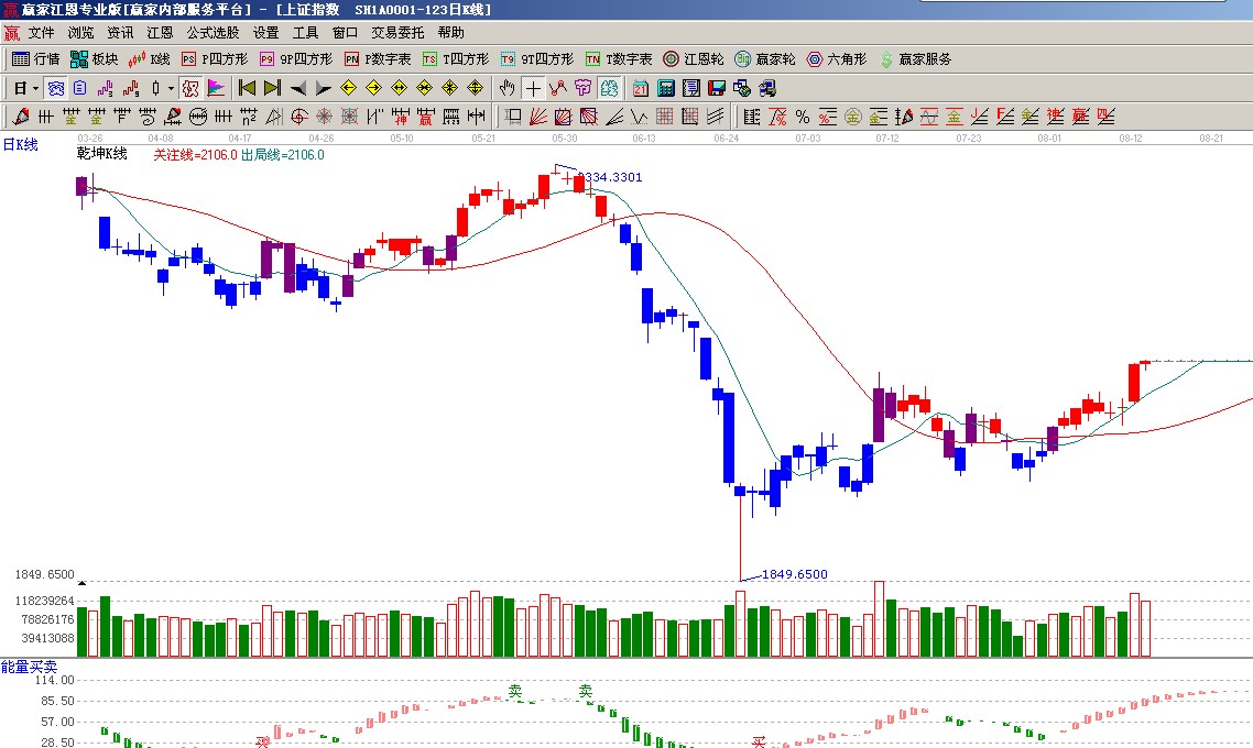 ★依據(jù)贏家江恩系統(tǒng)乾坤K線提示:出局線與關(guān)注線保持多頭趨勢,紅色K線持股看漲;(1)