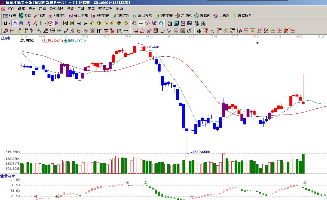 ★依據(jù)贏家江恩系統(tǒng)乾坤K線提示:K線破短線出局線,依據(jù)規(guī)則短線出局,波段減倉(cāng),等待紅色關(guān)注線(1)