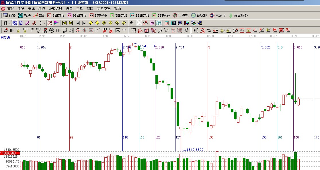 ★依據(jù)贏家江恩系統(tǒng)乾坤K線提示:K線反抽短期出局線,整體K線為紅色安全操作區(qū)(1)