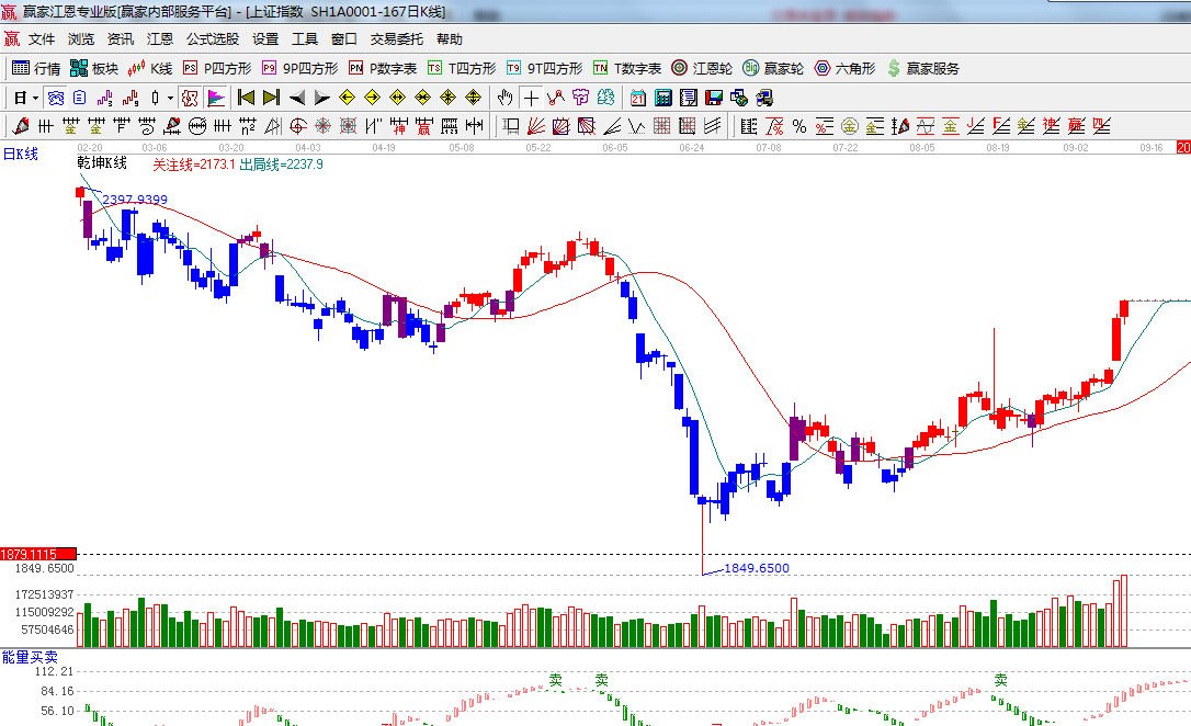 ★依據贏家江恩系統乾坤K線提示:紅色區(qū)域表示強勢做多區(qū),策略上以持股為主;(1)