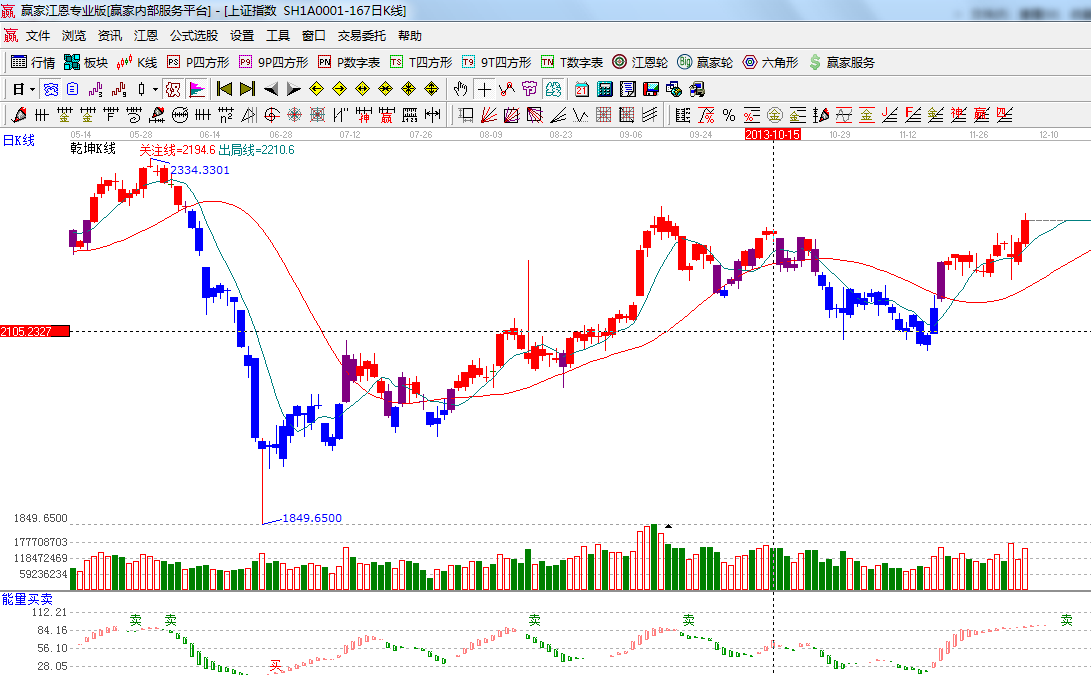 ★依據(jù)贏家江恩系統(tǒng)乾坤K線提示: 紅色K線收盤在關(guān)注線上、繼續(xù)看多;