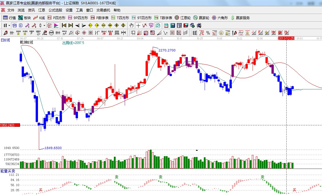 ☆依據(jù)贏家江恩系統(tǒng)乾坤K線提示:K線收盤在出局線上方,短期將展開弱勢下的技術(shù)修復(fù);