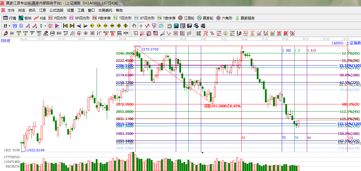 ★ 依據(jù)贏家江恩系統(tǒng)波段百分比提示:135度支撐位置觸底反彈,突破江恩120度線,上方江恩第一阻力關(guān)注90度2031點,第二阻力位45度2055點。