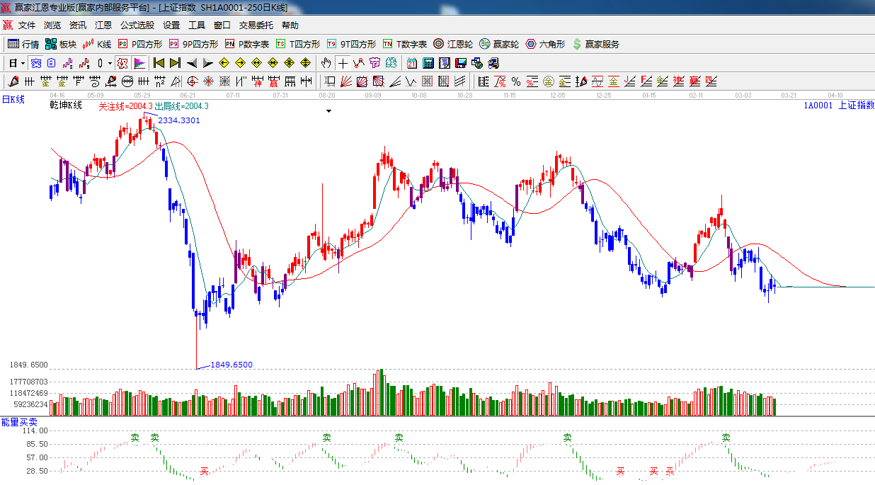 ☆依據(jù)贏家江恩系統(tǒng)乾坤K線提示:藍色休息區(qū),出局線下方,依據(jù)規(guī)則休息為主,波段看空。