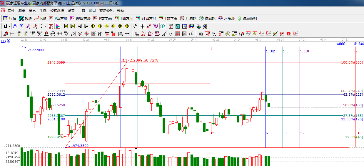 ☆依據(jù)贏家江恩系統(tǒng)波段百分比提示:破位江恩180度2060點支撐,今天留意此位置的爭奪,上方支撐135度2038點。