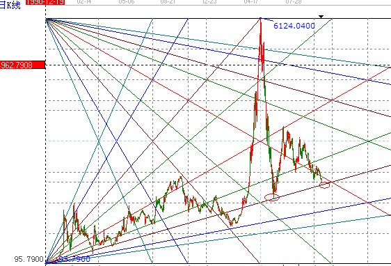 以上證指數(shù)開(kāi)盤第一天的時(shí)間至目前已知的高點(diǎn)6124點(diǎn)為終點(diǎn)做圖,贏家江恩軟件用戶可點(diǎn)擊工具欄江恩箱圖標(biāo)制圖,以1990年12月19號(hào)最低點(diǎn)95.7為起點(diǎn),2007年10月16號(hào)的最高點(diǎn)6124點(diǎn)為終點(diǎn)結(jié)果如下圖,圖形畫好后需要設(shè)置步長(zhǎng)向后延伸,起點(diǎn)與終點(diǎn)共4125個(gè)交易日,安此交易日進(jìn)行倍數(shù)或黃金分割關(guān)系放大后得出下圖,歷史上已知的重要低點(diǎn)如1664在2*1角度線上,當(dāng)下大盤也運(yùn)行至此線附近,需要投資者重點(diǎn)關(guān)注,與極反通道弱勢(shì)外軌線,江恩價(jià)格四方形多工具共振;